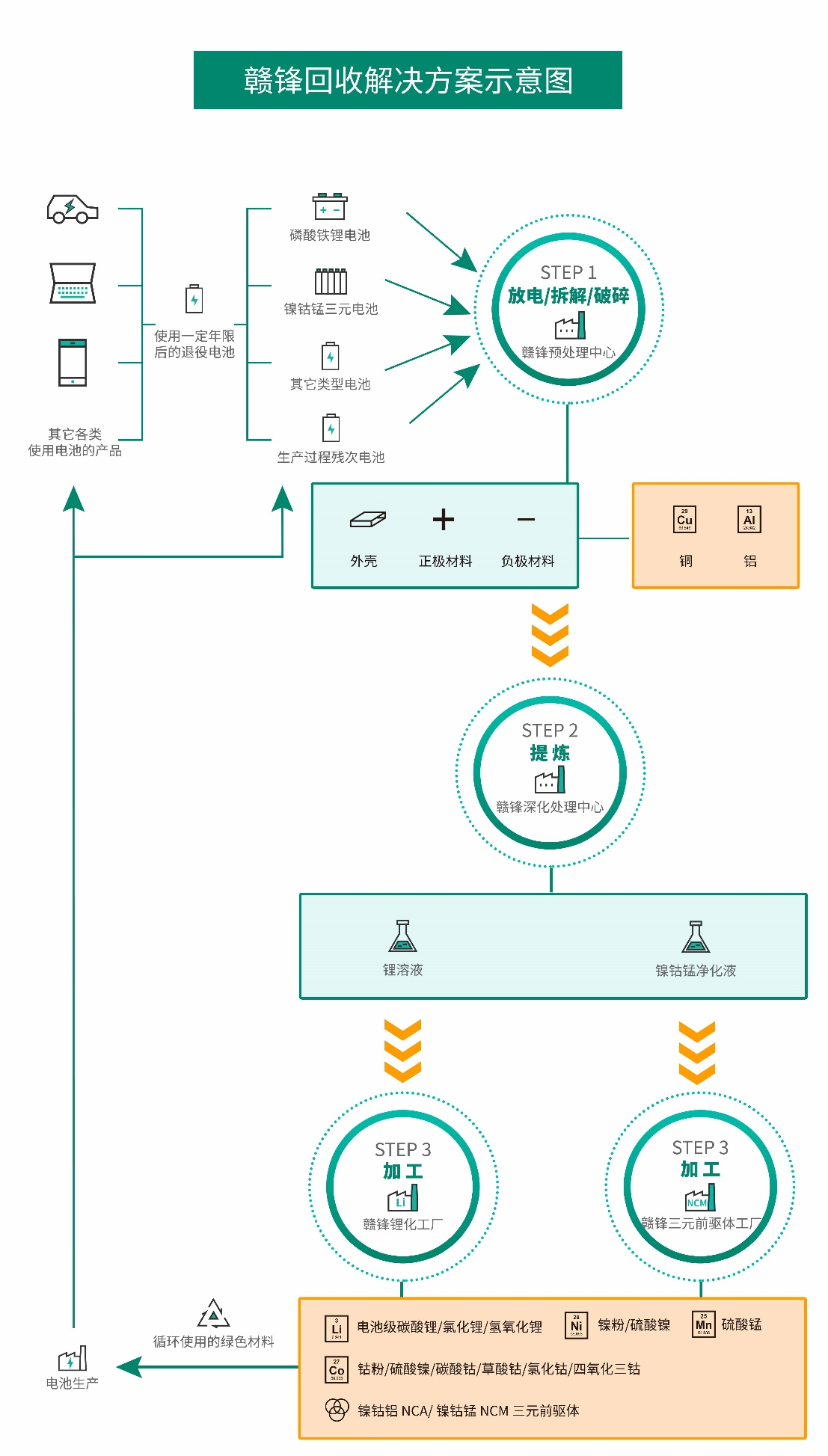 回收所產(chǎn)生的三元前軀體、鋰鹽等產(chǎn)品,將在質(zhì)檢合格后,重新被應(yīng)用于生產(chǎn)動(dòng)力電池、消費(fèi)設(shè)備電池或工業(yè)加工流程中。